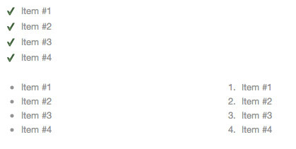 Lists can be styled by adding a simple class of "checkmark", or as just normal <ul> <ol>.